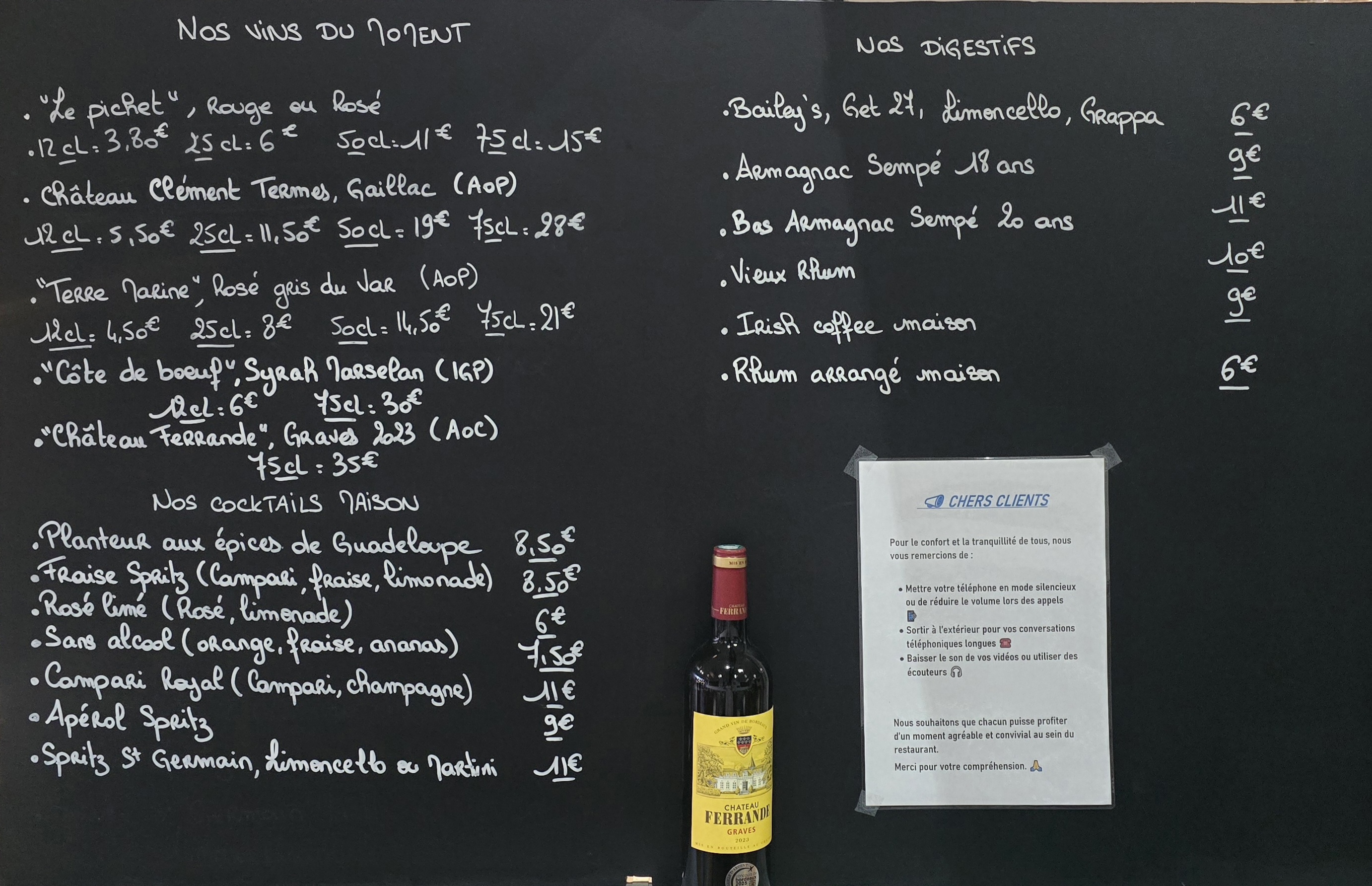 - Affichage obligatoire: capacité maximale 48 couverts à l'intérieur et 32 couverts en terrasse.
